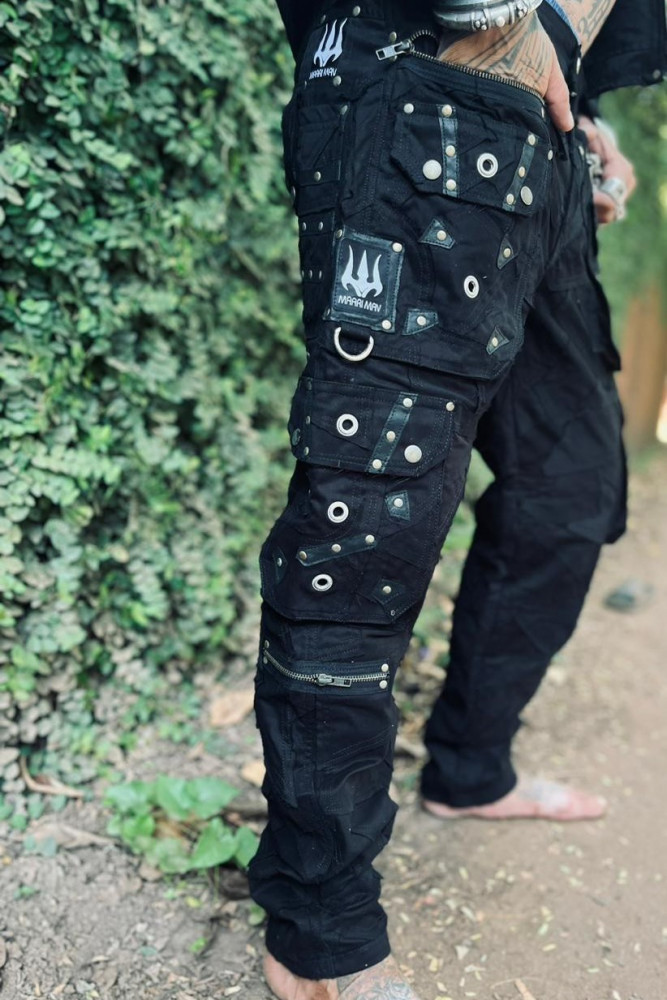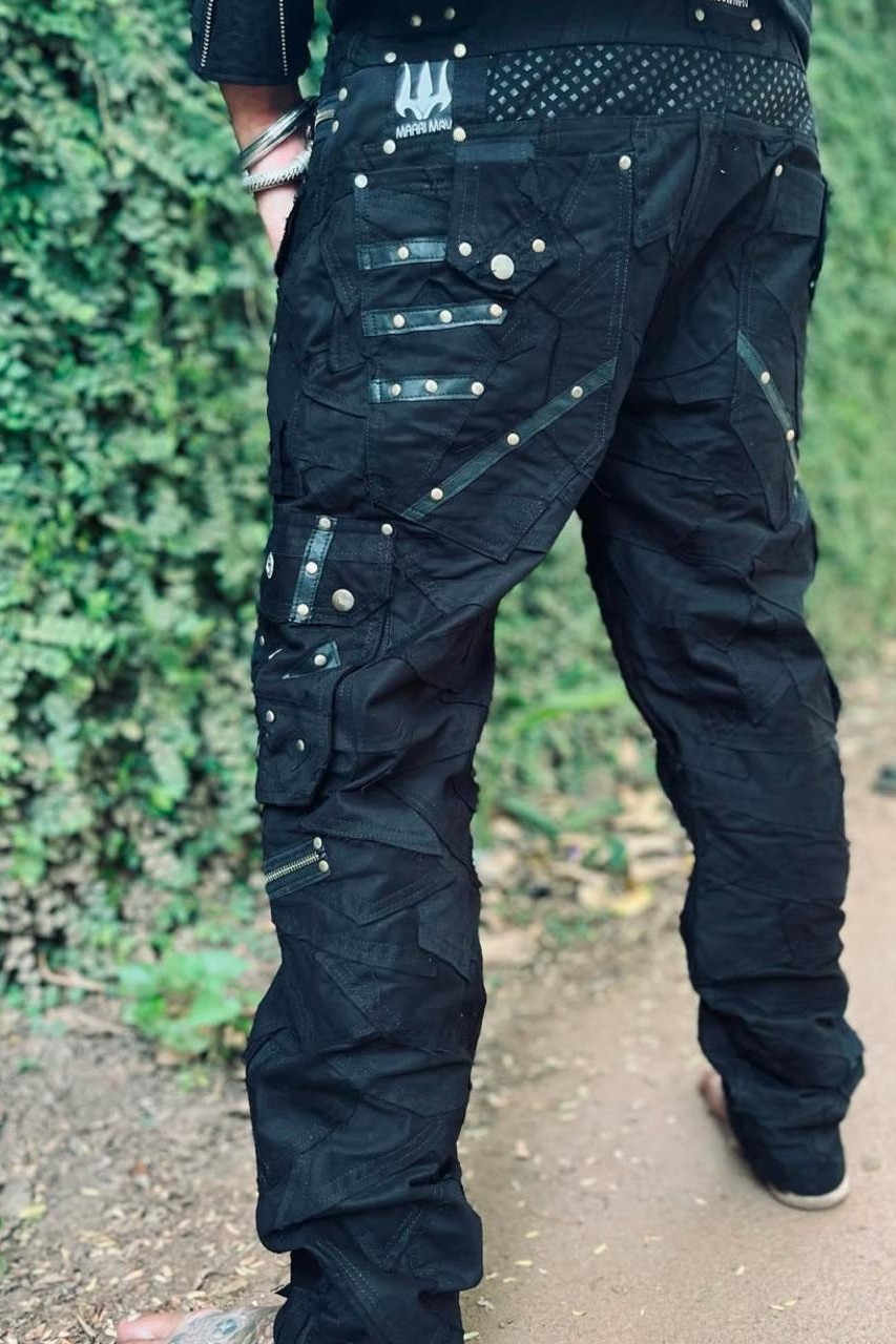 Shimbha long pants — a handcrafted, utility-style trouser in black heavy cotton twill with hand-stitched leather patchwork. Designed for durability and comfort, these pants use premium YKK zippers and brass buttons that resist rust. Each pair features a mix of functional pockets and decorative patch details made from randomly cut fabric and leather pieces for a one-of-a-kind look.